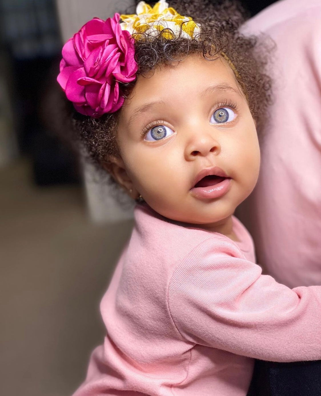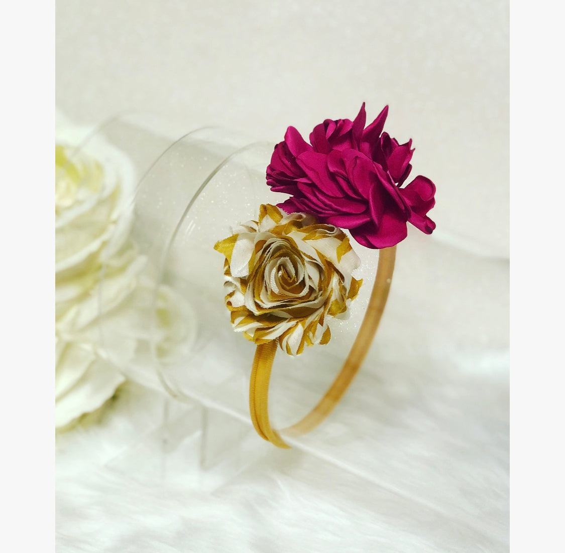 Mustard colored nylon handcrafted headband with matching striped rose and hot pink blooming accented toppers