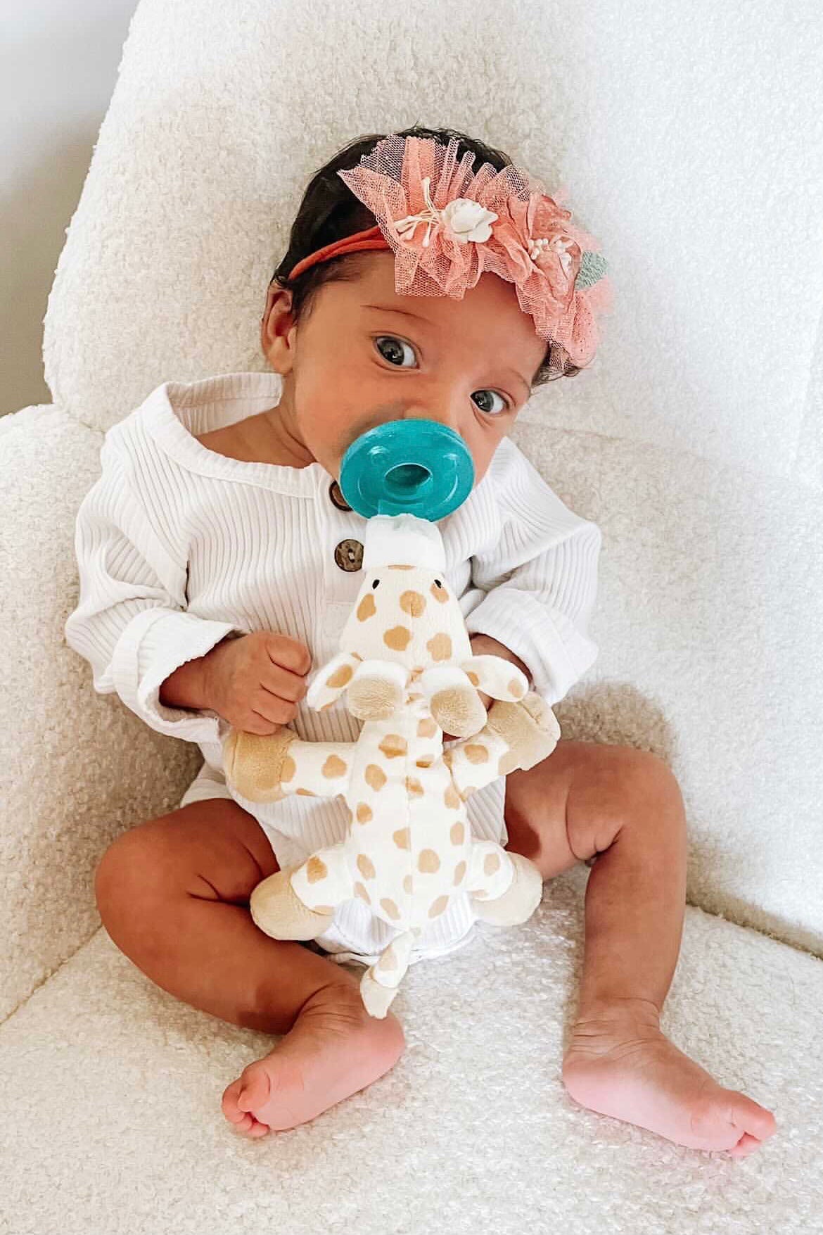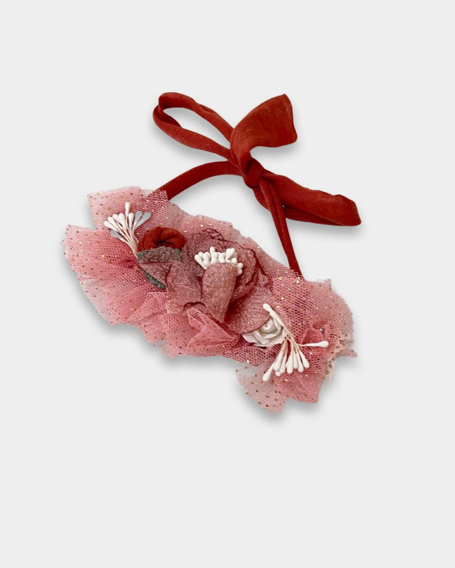 An adjustable cinnamon colored baby tie headband topped with delicate matching lace and floral accents