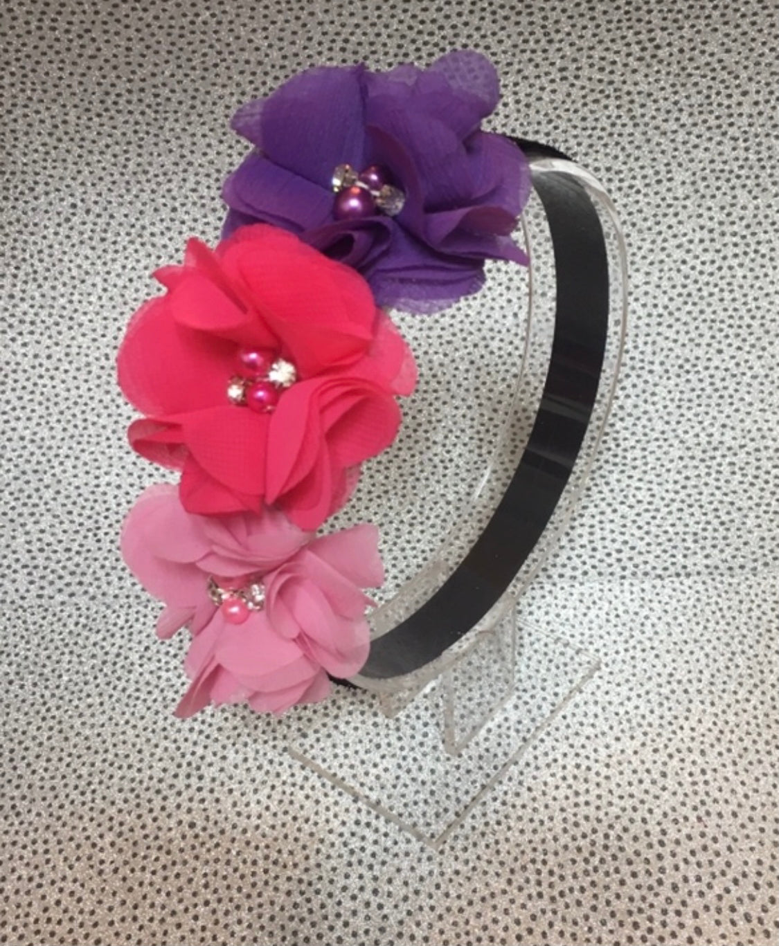 Handmade multicolored chiffon flower detail with pearlized/diamond accents and a black sparkly headband.