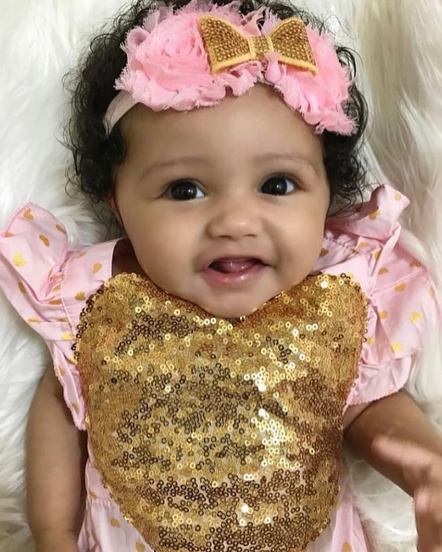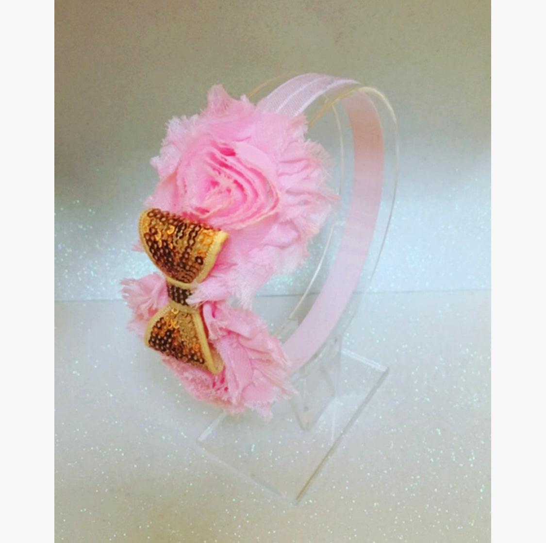 Handmade Baby Pink stretchy (size 0-6 months) headband with pink rose toppers and a gold sequin bow centerpiece.