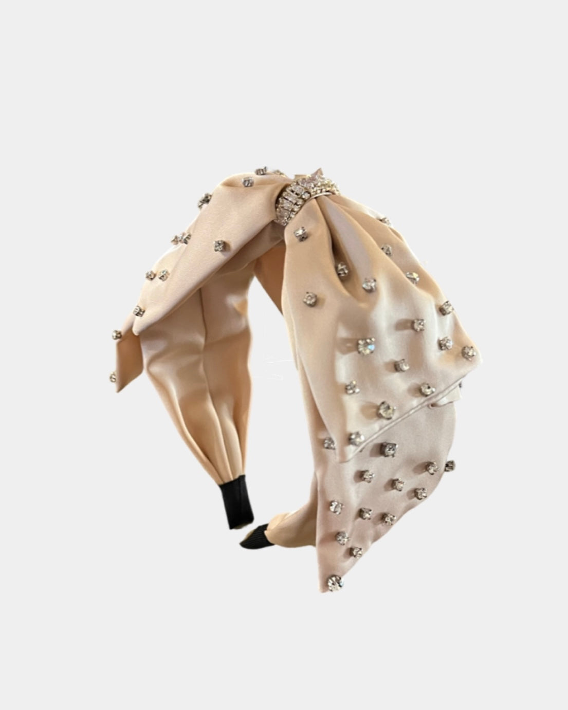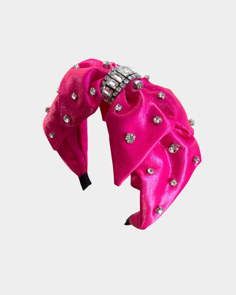 An elegant satin covered headband with rhinestone accents