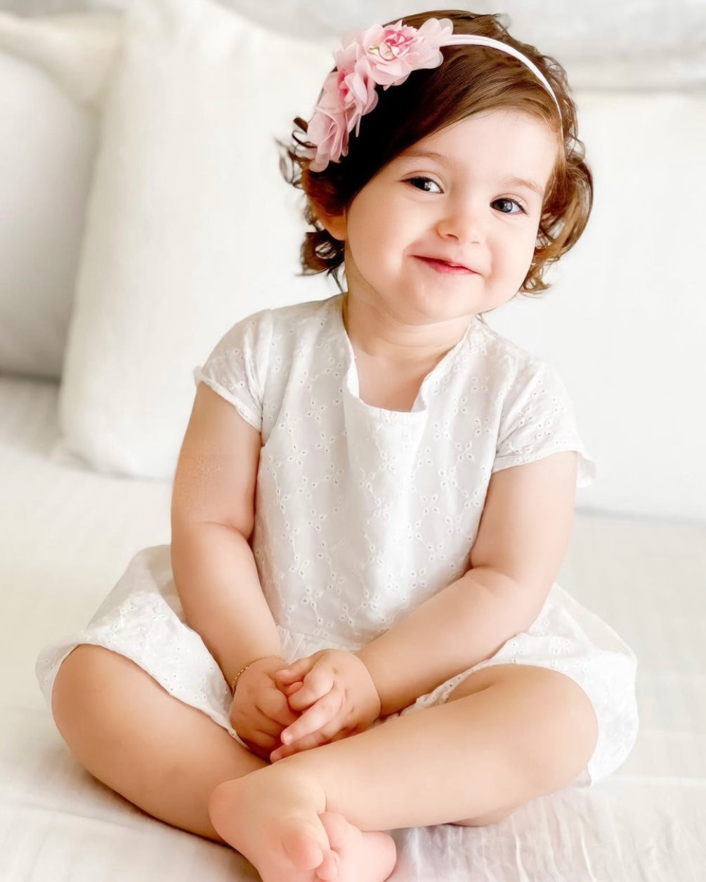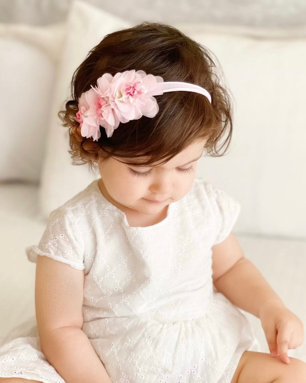 Nylon stretchy headband with chiffon floral toppers and satin center accents