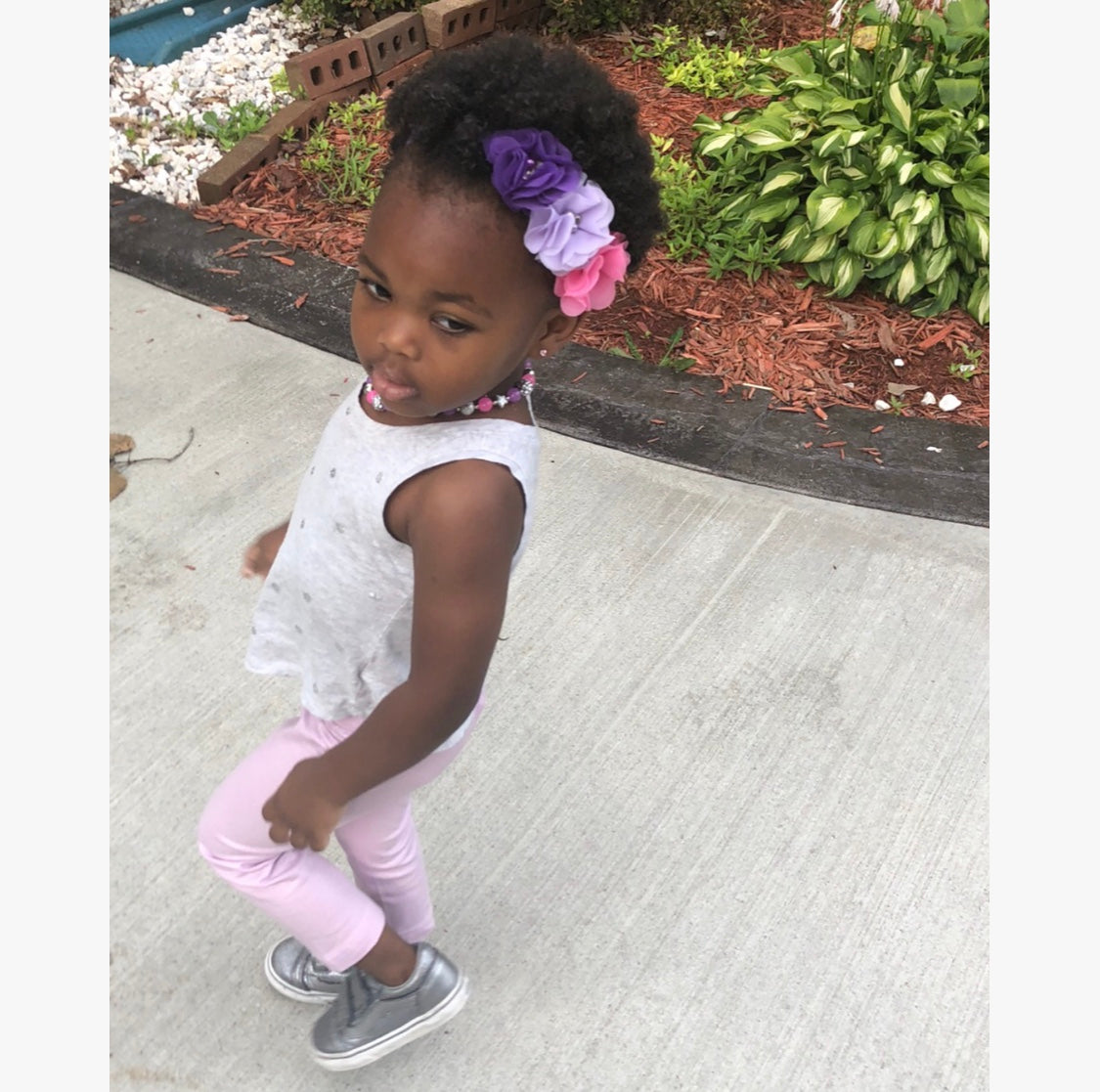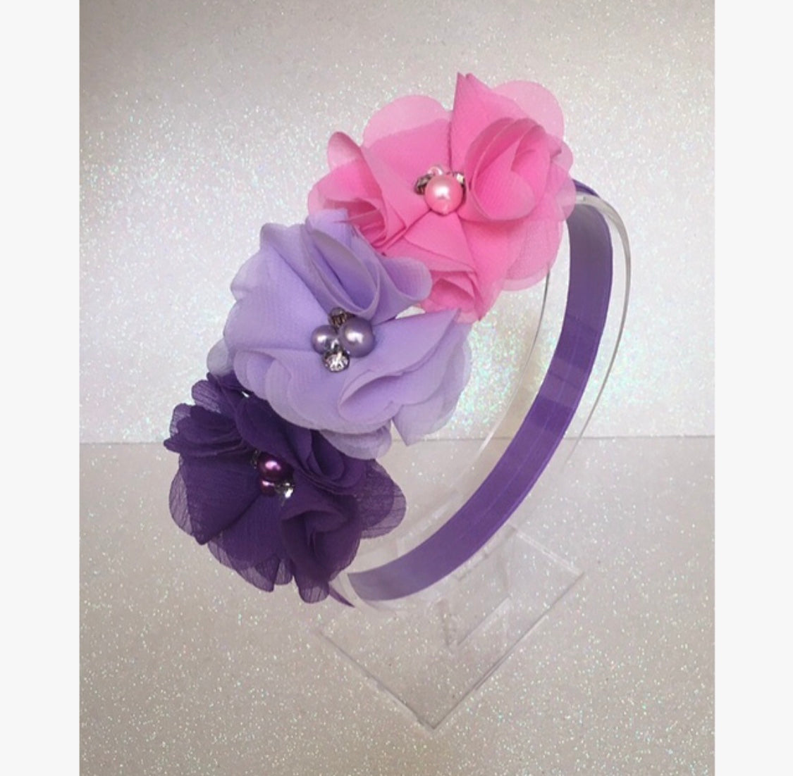 Purple stretchy handmade headband with floral toppers and rhinestone accents