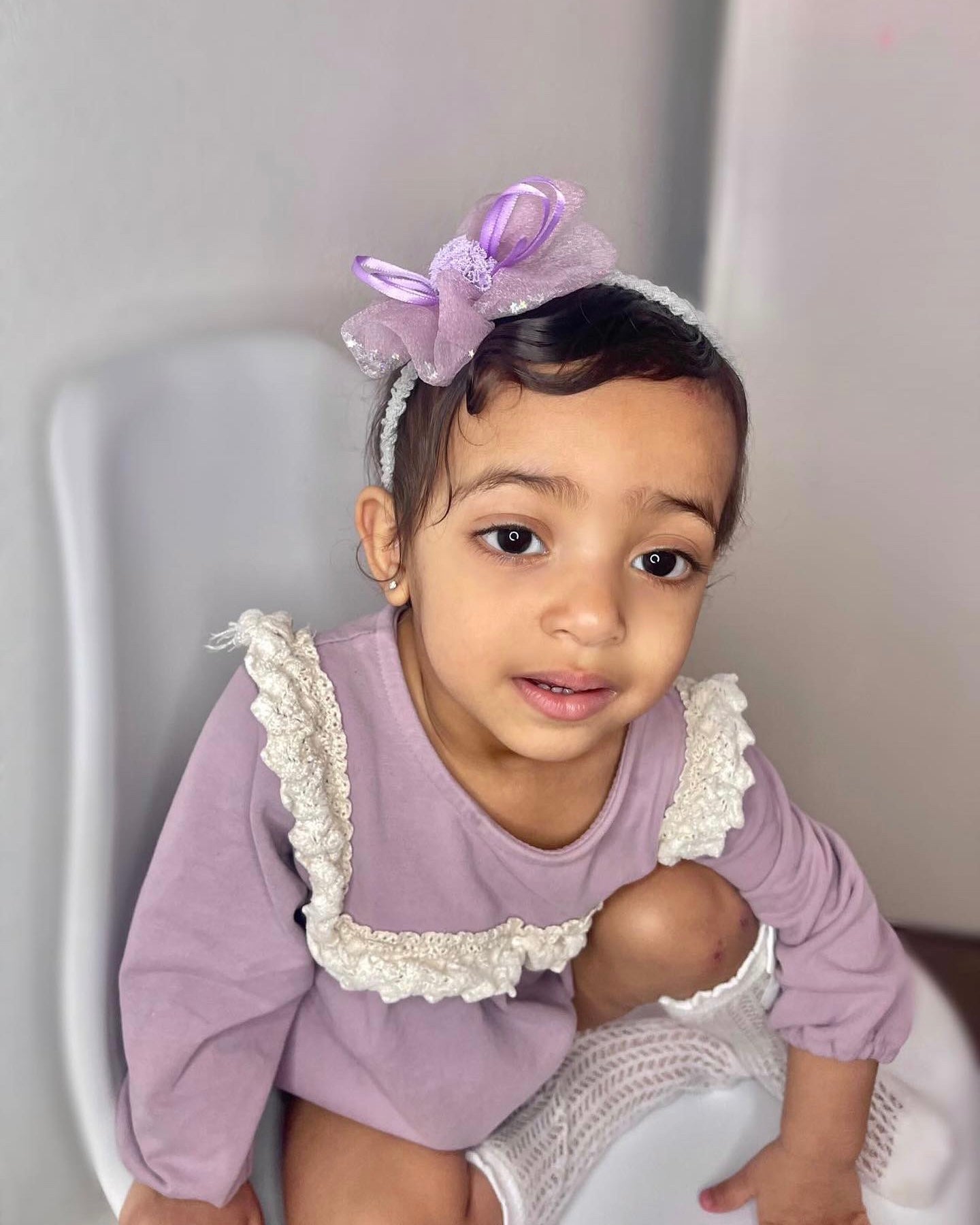 A grey ruched headband with a glitter filled tulle topper and a Pom/Ribbon accent
