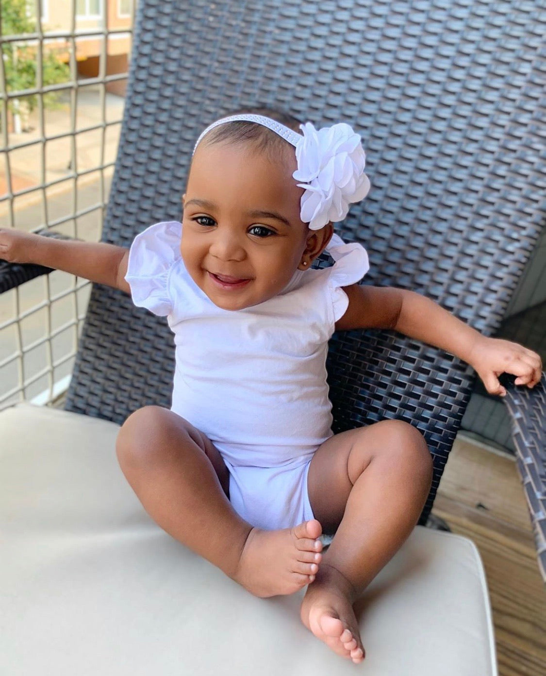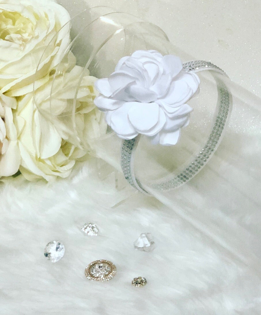 rhinestone encrusted handmade headband with blooming white floral detail.