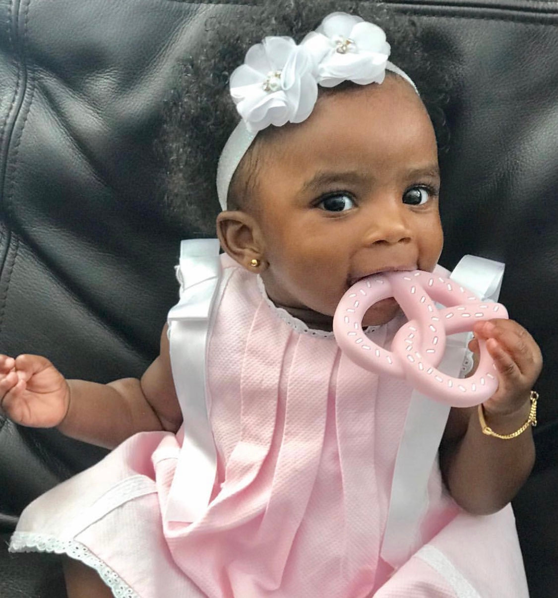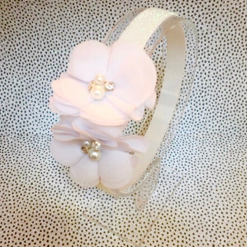 Iridescent sparkly (0-6 months) headband with floral toppers and rhinestone accents